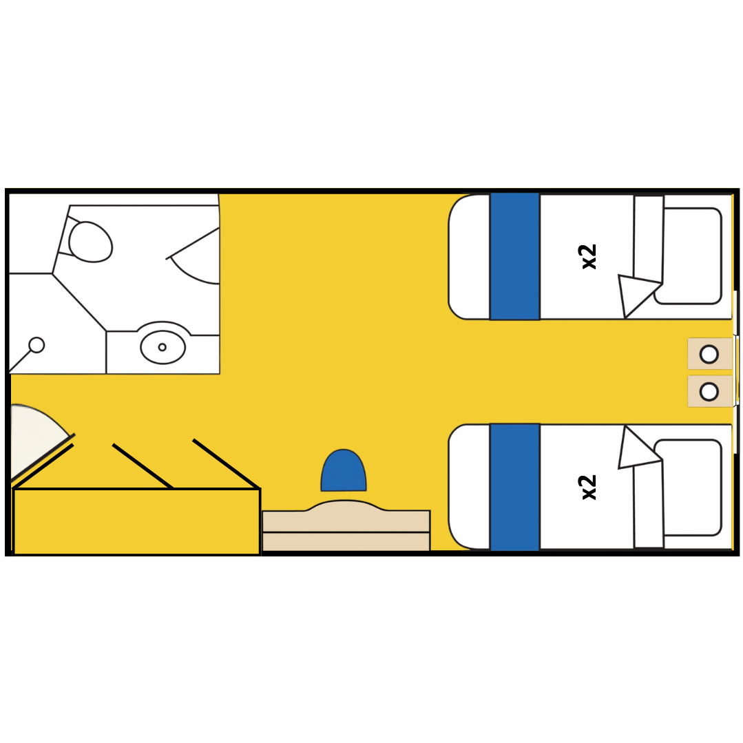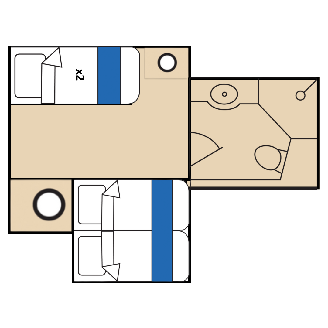 Guests booking Quad Share will have an upper or lower berth in a quad cabin on St. Helena. On Icebird, solo travellers will be allocated an upper or lower berth, while two guests travelling together will share a double bed. Both ships accommodate four guests per cabin, both with a private bathroom.Upgrade Option for guests in Quad Share on St. Helena: